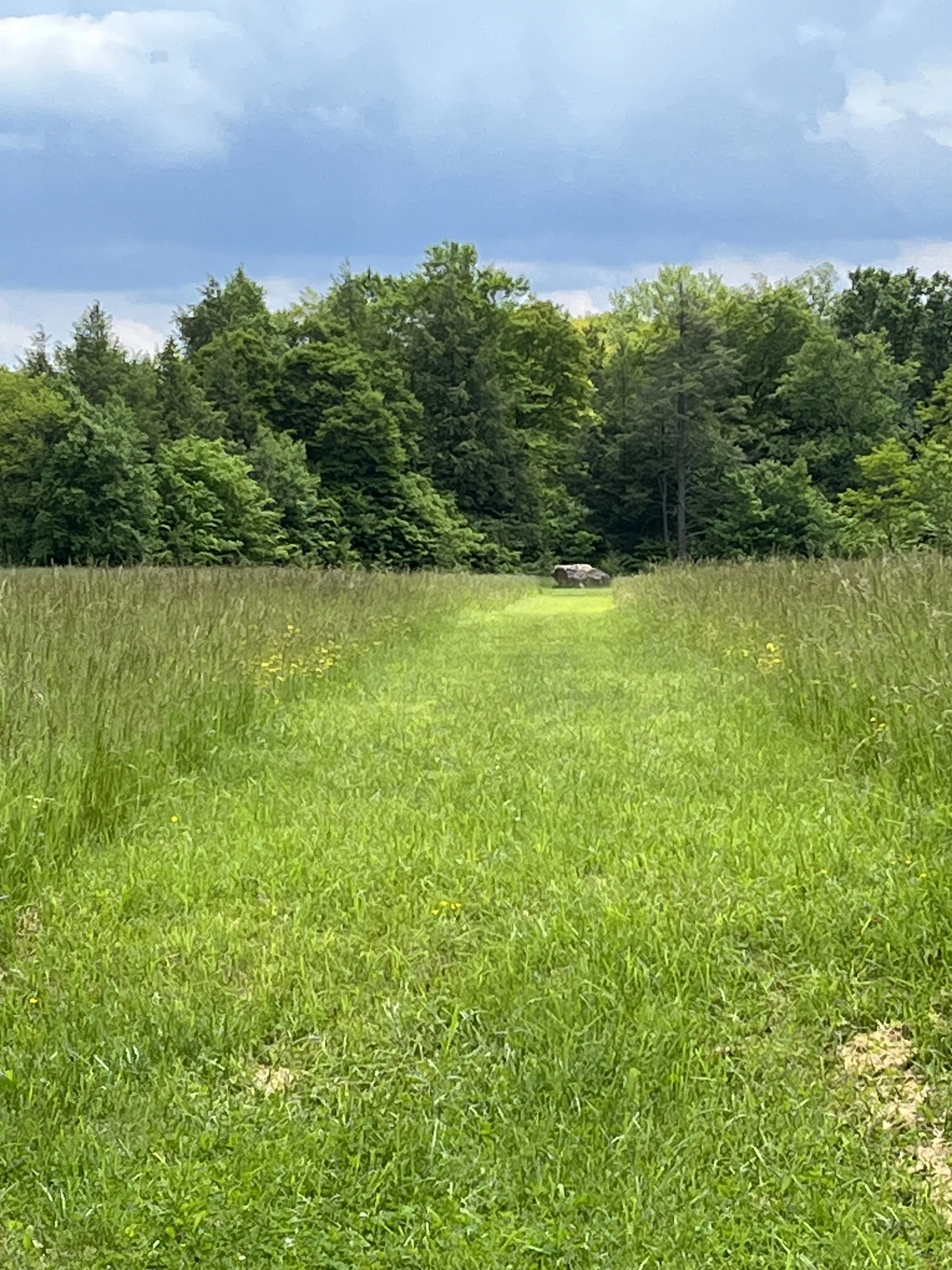 A mowed path through the waist-high grass leads to a substantial boulder marking the plane's initial impact. Beyond the boulder, stands the young rejuvenated forest twenty-three years after the huge fireball roared up the slope incinerating everything in its path. And you're thinking of a display back at the museum. Innumerable bits of debris plucked from the crash site--a small piece of plastic driver's license, a charred button, a snip of aircraft aluminum. Other bits and pieces lie unseen under the green sward hosting the crash site, the fence and the inscribed names and the large boulder. Millions of bits and pieces. Now an eternal part of this unique cemetery, incorporated into the rich brown soil of western Pennsylvania, intertwined with grass roots and tree roots and an aura of ineffable sadness.