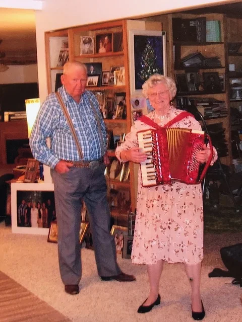 Celia Sandoz Ostrander Barth plays her prized Swiss accordion in her living room while husband Lyle looks on