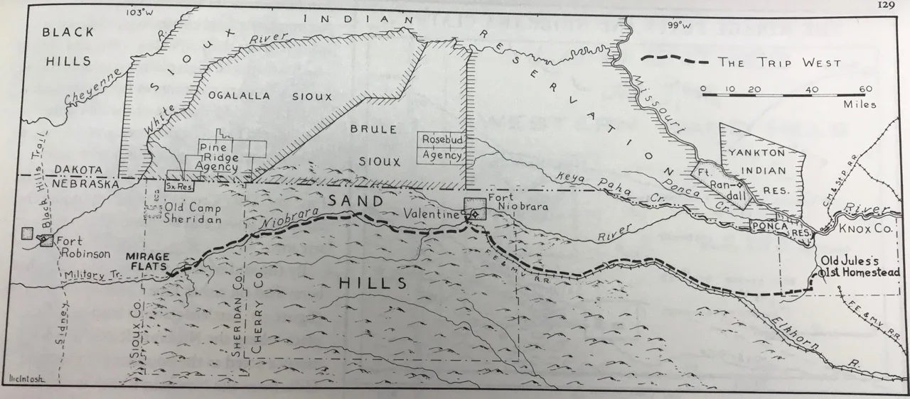 C. B. McIntosh's map of Old Jules Sandoz's journey from his Verdigre homestead to Mirage Flats